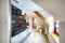 Three sides of the room have a deep ledge with shelves, and there is a shoe/boot shelving rack by the door.