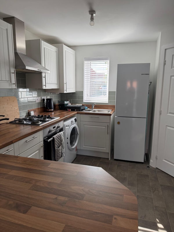 Kitchen/Dining: Full use of the modern kitchen-diner with island seating—great for cooking and meals. A washing machine & fridge / freezer is also located in the kitchen.