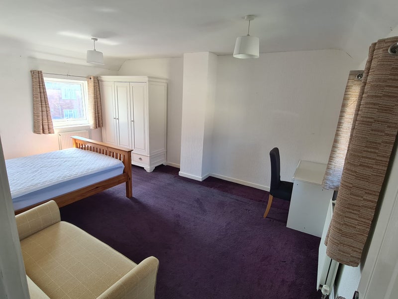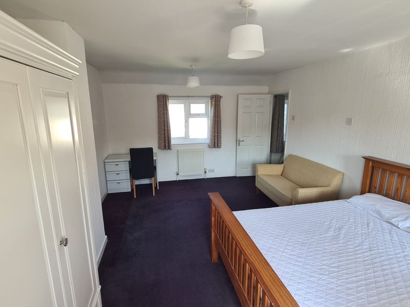 The larger room is fully furnished with a double bed, mattress, sofa, bedside table, large wardrobe, desk and desk chair.