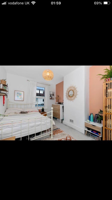 The room itself is fully furnished, with a wardrobe, chest of drawers, bedside table and double bed. It’s at the back of the house overlooking the garden- nice and quiet with evening sun.