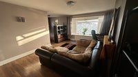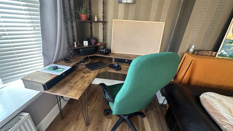 1) A living room which has a big comfy L shaped sofa, large enough to have a guest sleep on, and also a corner desk with plenty of room to workout or do yoga between.