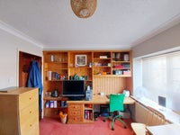 One very large comfortable double bedroom with rural views to let in a large 5 bedroom family home. The private room is furnished and carpeted including window blinds, fitted wooden framed double bed with full under storage, fitted wardrobe, cupboard and drawers including a large desk/study area and fitted shelving and a TV/video combination set.