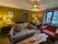 In the living room, there is a wood burning stove, and more comfy sofas and a dining table.