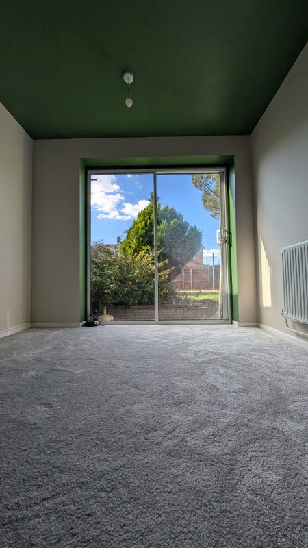 A newly redecorated garden double bedroom. Double doors going out to large sunny back garden. Unfurnished, pull out bed would be available if required temporarily. Shelves are built into a open wardrobe for storage. Looking for a friendly flat mate, I'm respectful of people's own space but enjoy to be social/cook/work/hike/dance. Shared living, kitchen, bathroom - I like a clean space :) must be working. Thanks