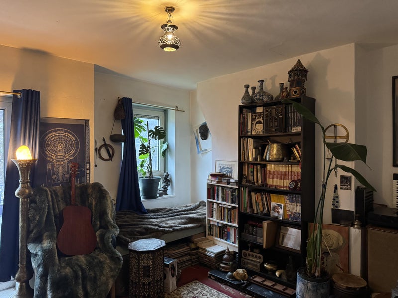 I’ve got a quirky, bohemian-style flat filled with character, oddities, and a few antiques and a bit of an “art work in progress” vibe. It’s cozy, unique, and ready to live in, even though I’m still fixing up little bits here and there. And we have big dog called Savi staying a lot of the time these days as I’m often caring for him, he’s very friendly and cuddly.