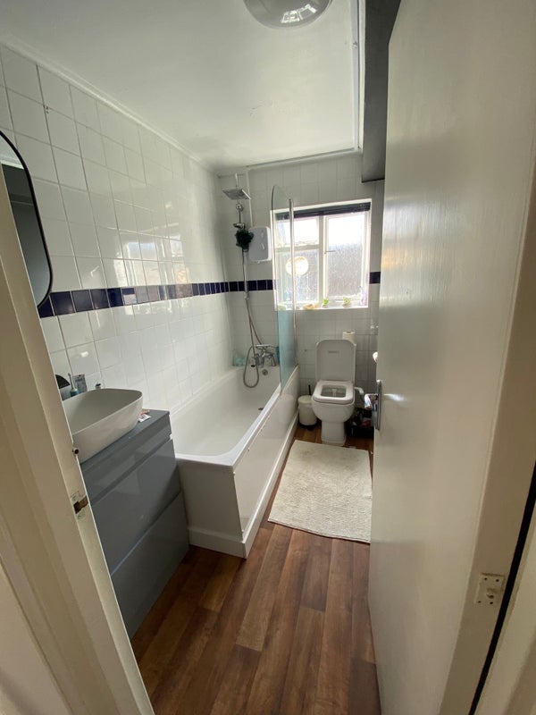 The bedroom available is the one next to the bathroom on the Floorplan attached. It has a huge sash window with a white black out blind, large mirrored built-in wardrobes at one end, and a double bed.