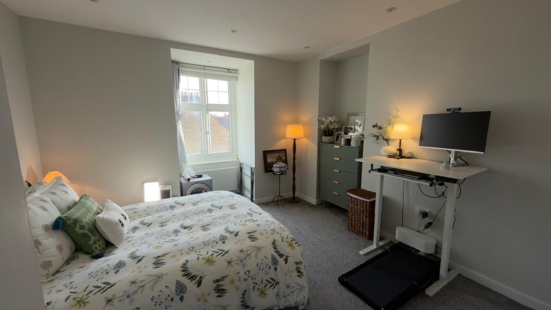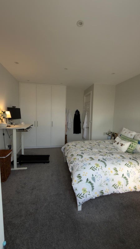 Super spacious room available (king bed included)🛌 (4.29m x 5.30m): This really spacious room comes with a very comfy and large king bed with space for a desk, AND a tv unit if you want, also with AMPLE in-built storage, with a big south facing window for lots of natural light that looks onto a quintessential British road.