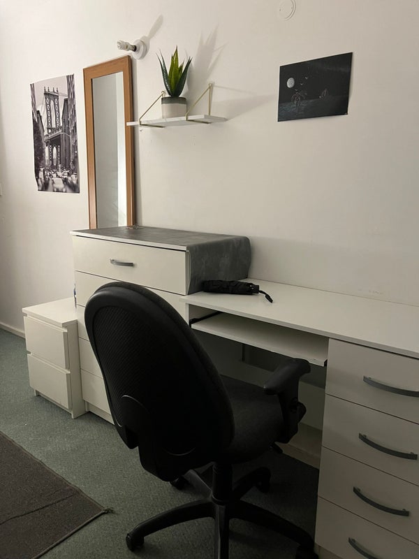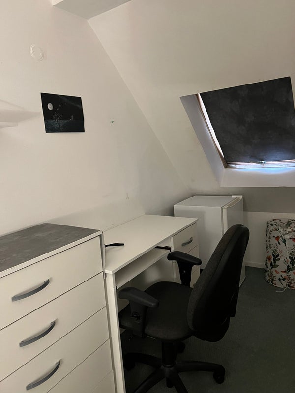 A bright and private room located on the ground floor, offering a unique level of privacy similar to a self-contained space. The room has direct access to the kitchen and benefits from a private toilet just outside, in the hallway leading to the front door.