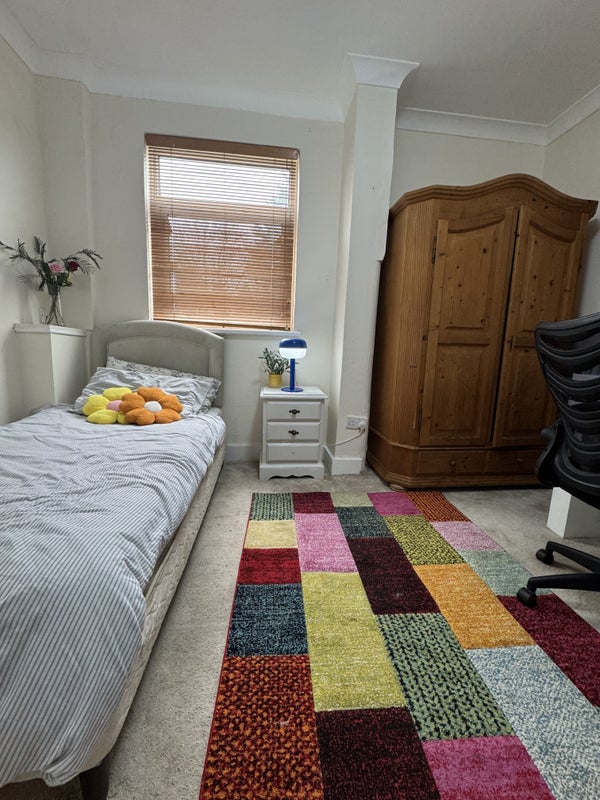 A large single room to let in a family home, located in Beckenham, in a shared house, the room is fully furnished with bed, wardrobe, desk and chair, people in the house are all very polite and friendly.. The house is only 5 minutes walk to Kings College, 10 minutes walk to Beckenham Junction and 5 minutes walk to clockhouse station, 2 minutes walk to the high street, the Sainsbury’s and the park is cross the road,