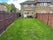 Good-size garden with patio (decking) and lawn at the back of the house, a table for six people, and a tool shed.