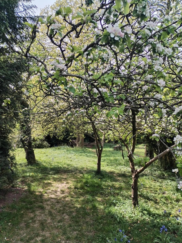 There is driveway space for a car. The outside space includes a patio (table & chairs out in the summer) and garden with woods and fields beyond giving access to local walks around the area and over to the local pub and a countryside cafe for walkers/cyclists is a short walk away across the fields and woods.