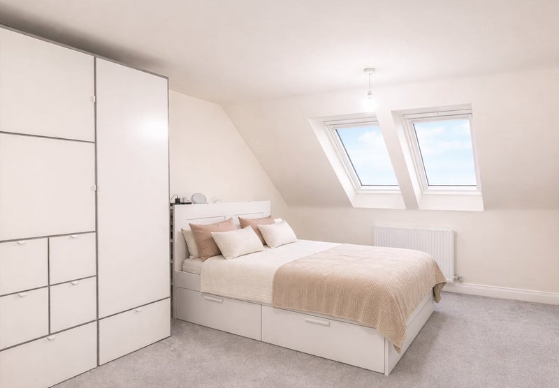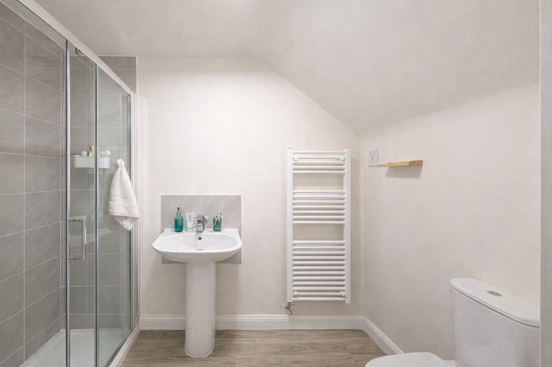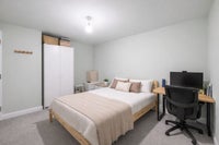 On the second floor, there’s a large en suite double room available. It has multiple wardrobes, beautiful windows with lots of natural light, and a secure door lock for added privacy.