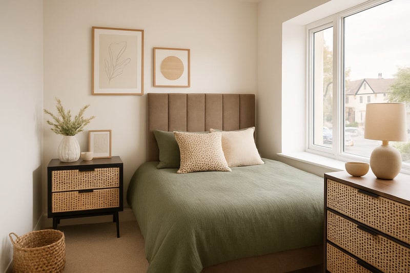• Modern furnishings including bed, wardrobe, and bedside furniture