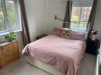 A double room is available in Denmark Hill. The bedroom is furnished with a king size divan bed base and mattress, a chest of drawers, a built-in walk-in sized cupboard / wardrobe and shelves.