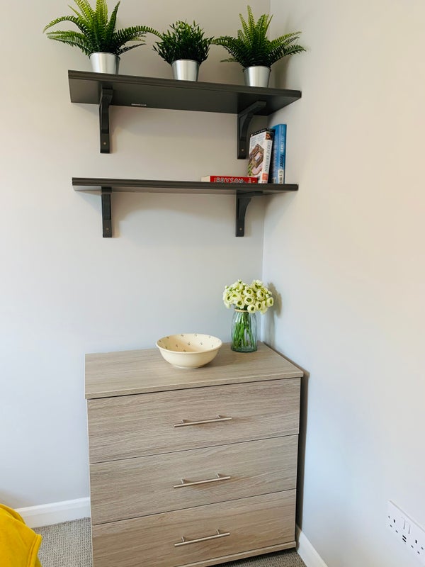 Each bedroom has: a bed with mattress and under bed storage space, two wall shelves, a wardrobe, chest of drawers, bedside drawers and bedside lamp.
