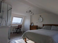 The bright and spacious bedroom has it's own shower and sink, a double bed, plenty of storage and a desk.