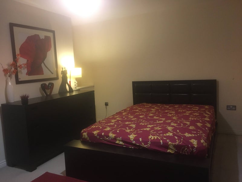 - Double bed, dual large working desk and chair, chest of drawer