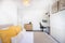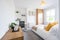 The adjoining dining space is furnished with a dining table to seat six, creating a warm and inviting atmosphere for meals or downtime with housemates.
