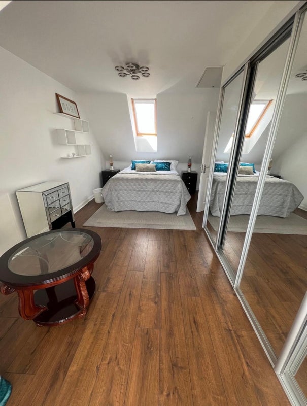 A stylish small double room featuring wall-to-wall sliding wardrobes, ideal for professionals looking for comfort and efficient storage in a peaceful setting.