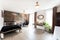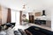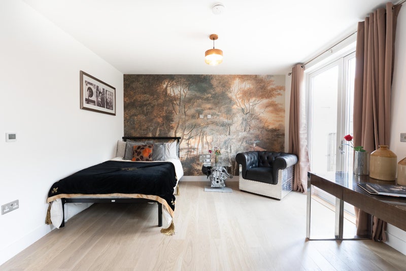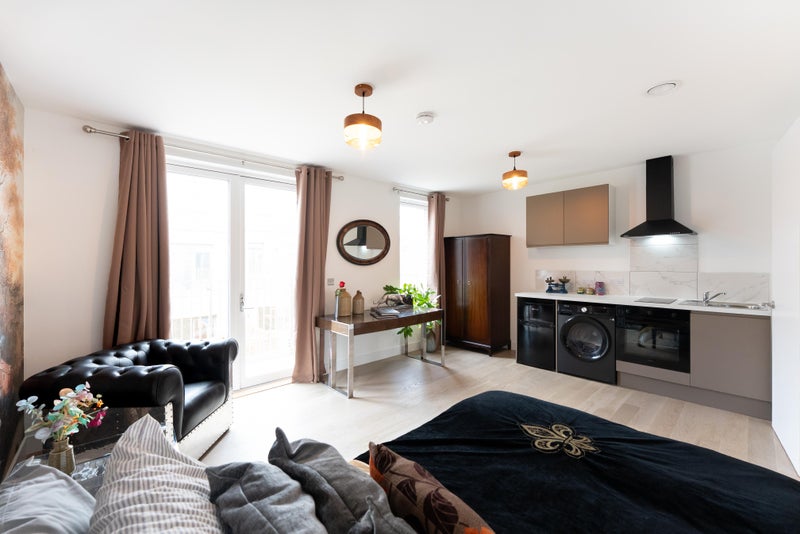 The studio comes with a complete kitchen including electric hob, oven, extraction fan, sink, fridge freezer and a washer dryer. Fully furnished with a small double bed, aviator style leather armchair, Audi enginee coffee table, large desk and wardrobe.