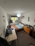 The room has a bed, wardrobe, computer chair and table and cupboard and radiator.