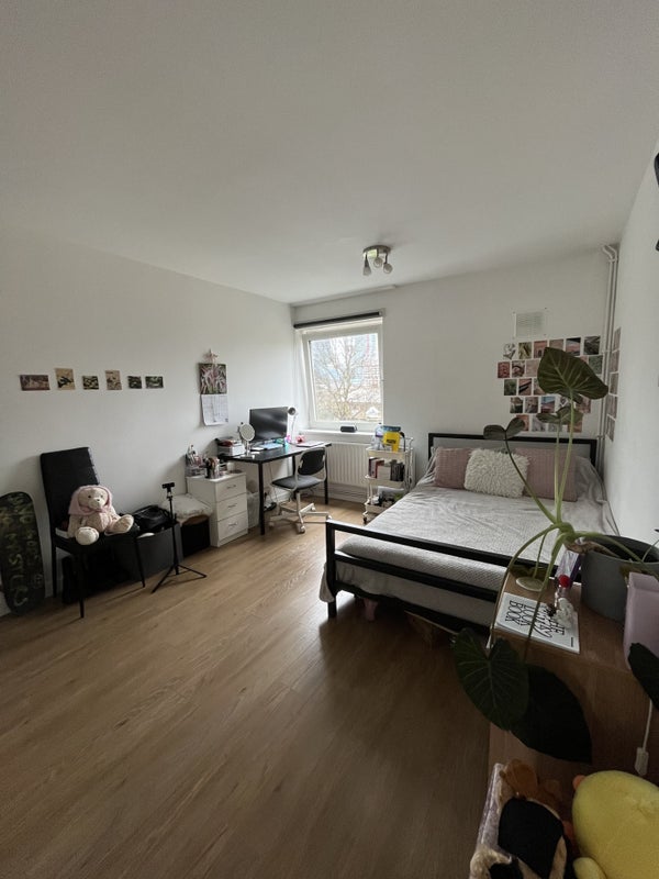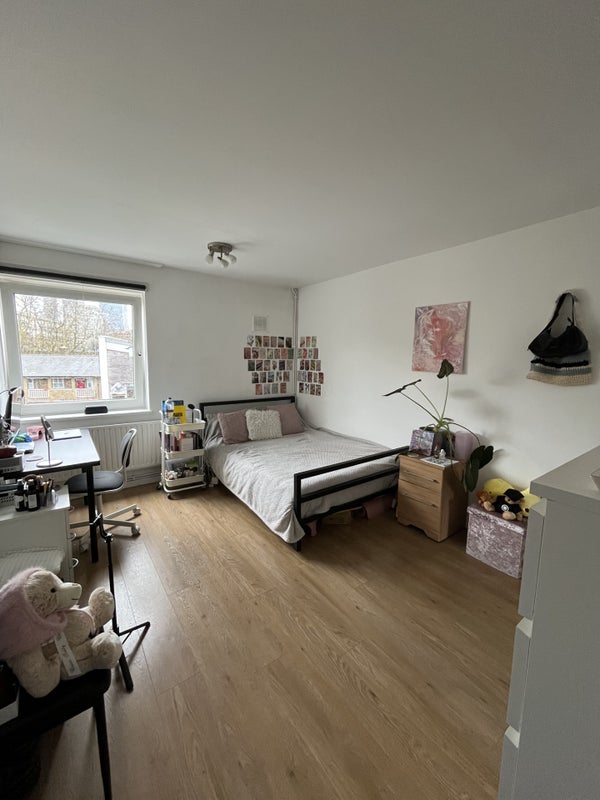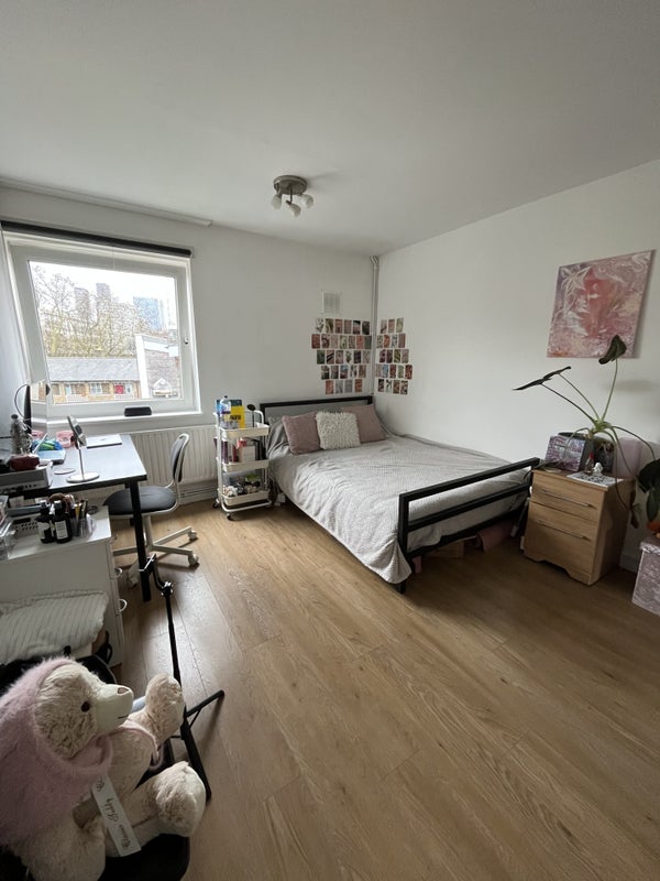 Furnished double room on the third floor of a 4-bedroom maisonette overlooking Canary Wharf. Shared kitchen and bathroom. Suitable for a single professional.
