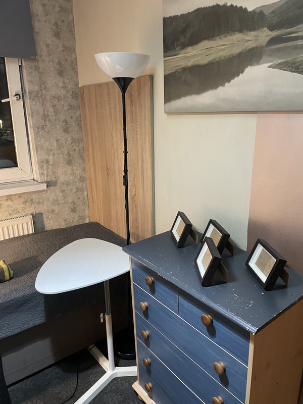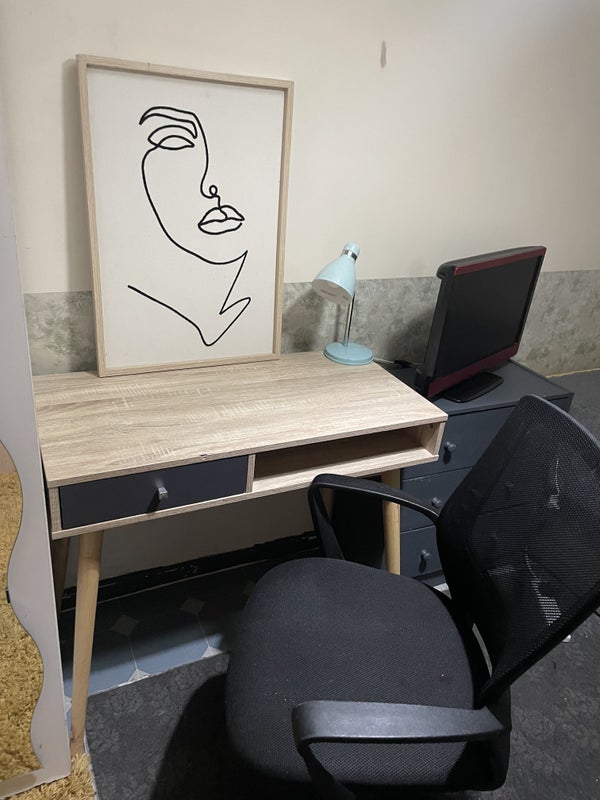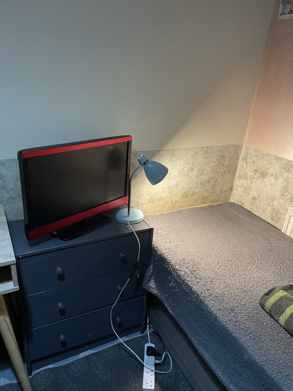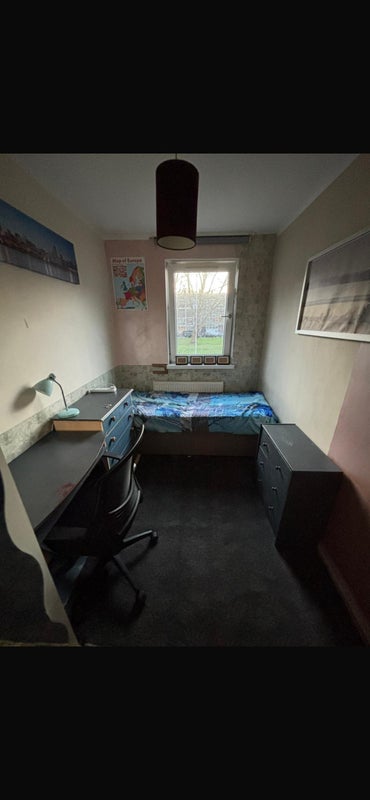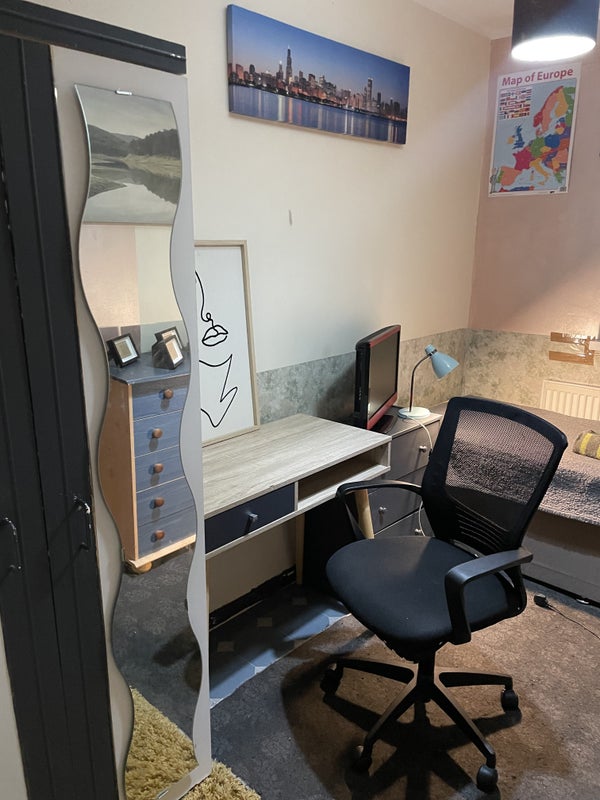 Room is fully furnished. wardrobe, good size desk to work on. confy chair, drawer, airmchair, TV etc screen.