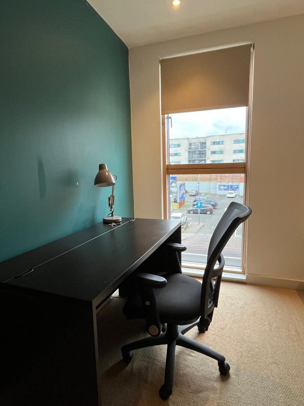 - A very spacious furnished, double-bedroom for single occupancy use. A double-bed, mattress protector, desk, chair, and lamp are included as well as a built-in wardrobe. The ensuite has a bath/shower, WC, sink and shelving.