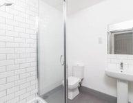 A stylish, modern shower room with a large shower and shower head, wash basin and toilet. Your shower room also comes with a heated, chrome towel rail.