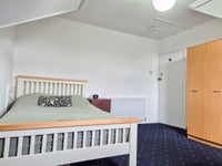 This cosy room comes fully furnished with a double bed, wardrobe, drawers, desk, chair, and shelving unit.