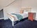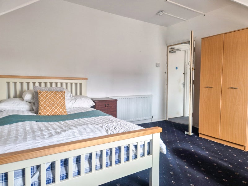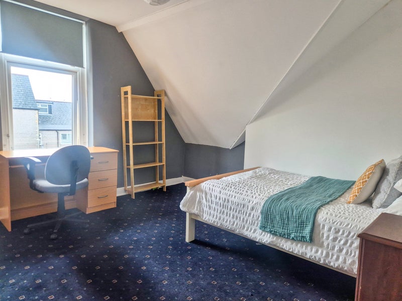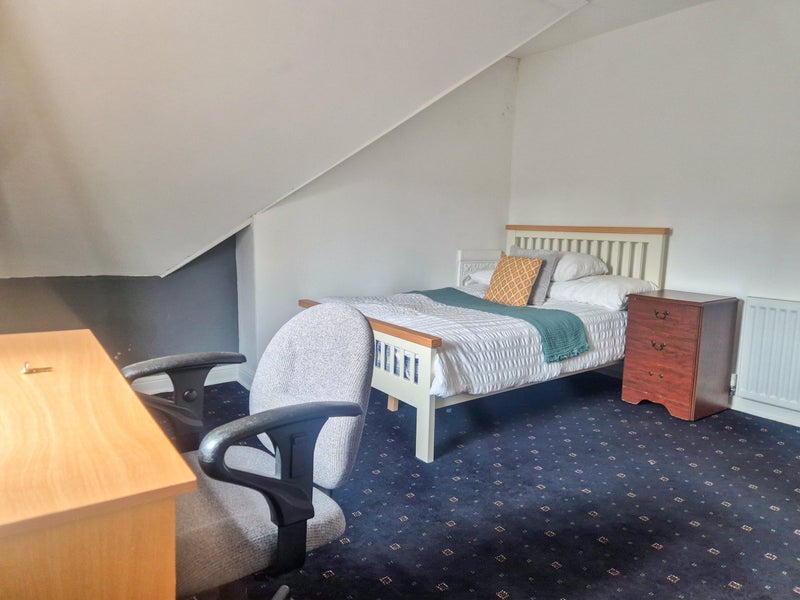 This cosy room comes fully furnished with a double bed, wardrobe, drawers, desk, chair, and shelving unit.