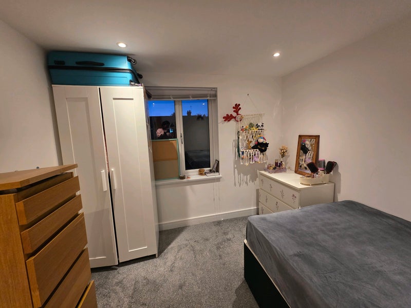 The room is fully furnished with a double bed, wardrobe, drawers, and a desk and chair.