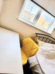 Good size bedroom with tons of storage to include a double wardrobe with hanging, a tall single glass door unit, work desk with chair and a wooden rack as seen in the photo.