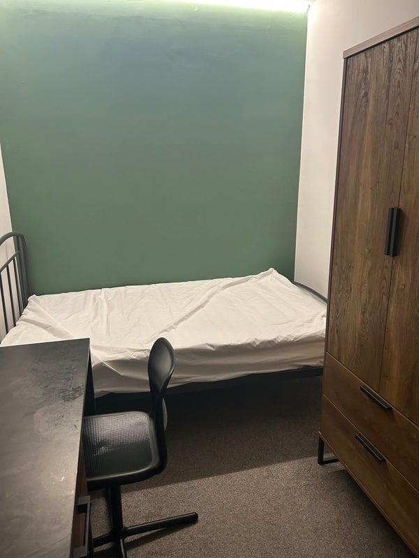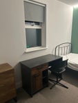 The room is fully furnished with a bed wardrobe desk chair and storage. It is clean comfortable and ready for immediate move.