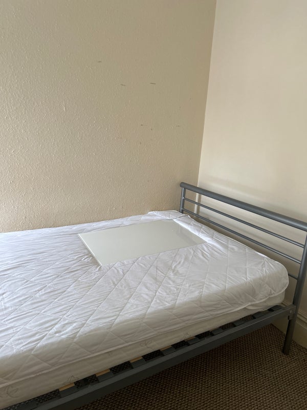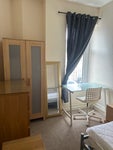 Room for single tenant upstairs with double bed, furnished with wardrobe, desk, and dresser. Property has 2 bathrooms and an extra toilet downstairs. Shared kitchen and living room with appliances such as dishwasher, oven, microwave, airfryer, kettle and toaster. Bills paid separately from rent, split between six water is typically £24, WiFi under £10, and electric/energy varies on usage.
