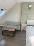 The room is located on the top floor for extra privacy. Enjoy a bright and stylish bedroom featuring a gorgeous sage green feature wall with bespoke wood paneling. The room is thoughtfully zoned, offering a comfortable sleeping area and a separate integrated seating nook with a sofa and coffee table—perfect for relaxing or working from home.