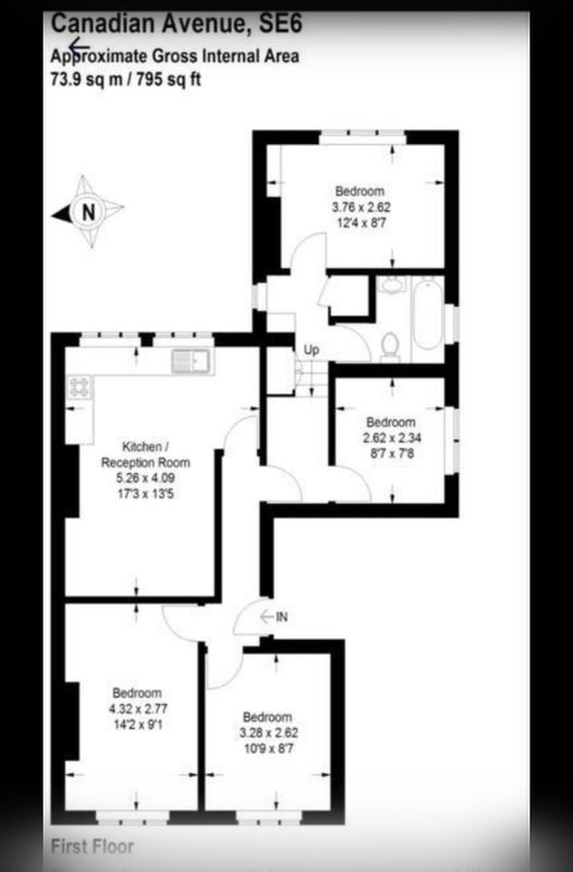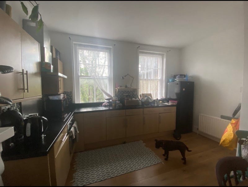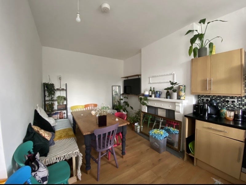 The flat has two rooms at the back and one at the front. There's a big kitchen/ dining space which overlooks our shared garden and a separate living room.