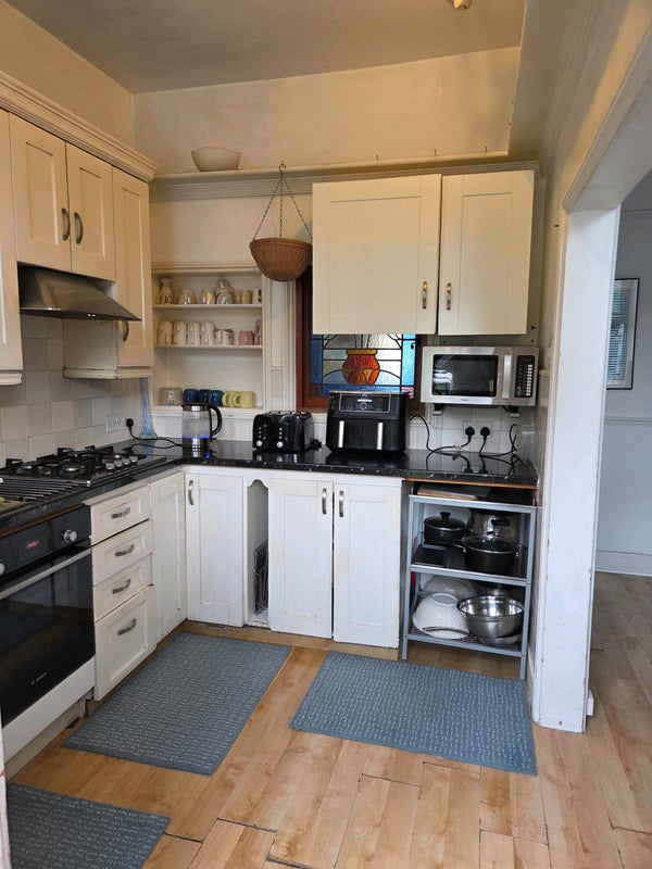 Fully equipped kitchen with modern appliances, including a double air fryer, microwave, sandwich maker, cooker and oven