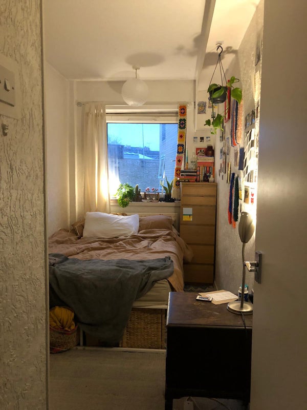 The location is super quiet and away from busy roads. The house doesn’t have a living room but we have a big kitchen. The room is quite small, so it wouldn't be ideal for some WFH. It comes with a mattress, a small built in wardrobe and chest of drawers. Some of the furniture/design in the pictures are from one of our flatmates who lives in another room now.