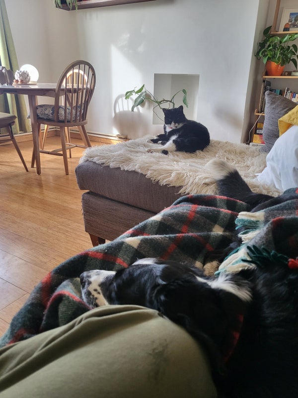 Live with 2 friendly outdoor cats and a dog who is chilled, quiet and gentle at home and a maniac outside with a ball. Happy home.