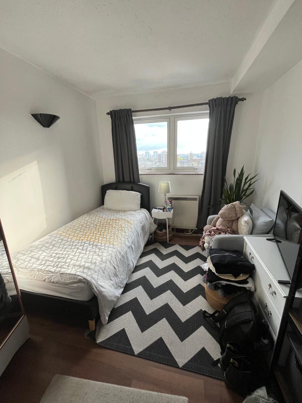 THE SECOND ROOM IS A SINGLE ROOM WITH A SINGLE BED, CHEST OF DRAWERS , WARDROBE AND HAS ITS OWN FRIDGE WHICH IS A BONUS. IT HAS A LOVELY VIEW OF WEST LONDON AND THE OCCASIONAL SUNSET.