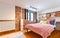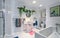 Hosts a generous contemporary bathroom with sleek fixtures and fittings.
