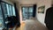 A bright, well-organised room featuring floor-to-ceiling windows that bring in plenty of natural light. The space includes a comfortable single bed, a dedicated work area with desk and monitors, and ample open storage with shelving and hanging space.