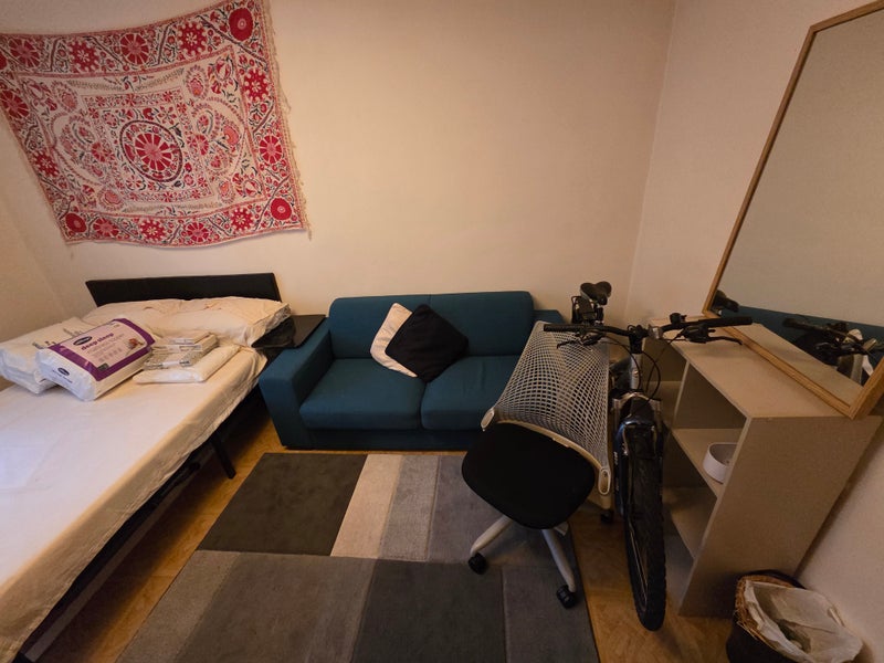 Pictures show the same room in different states. A 2seater sofa has been added, the clothing rail is now a double clothes unit and the table has been taken out. Still space for a piece of furnirure of your own or maybe a bike (pls Ignore the bike in the picture).