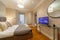 2. The fully fitted kitchen comes equipped with an oven/microwave, hob, fridge, kettle, toaster, dishwasher, and coffee machine.
