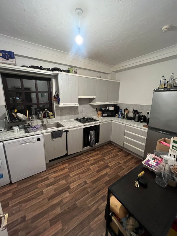 The bathroom is huge, with stone tiling, a freestanding tub, a separate shower cubicle, a large window and two mirrors. The house has one shared kitchen downstairs with four other housemates and gets good natural light and ventilation throughout.