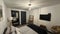 It’s a large two -bedroom flat with a modern kitchen, and bathroom, all connected by a hallway.