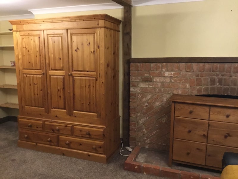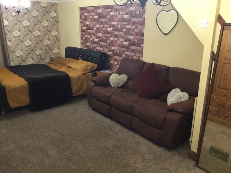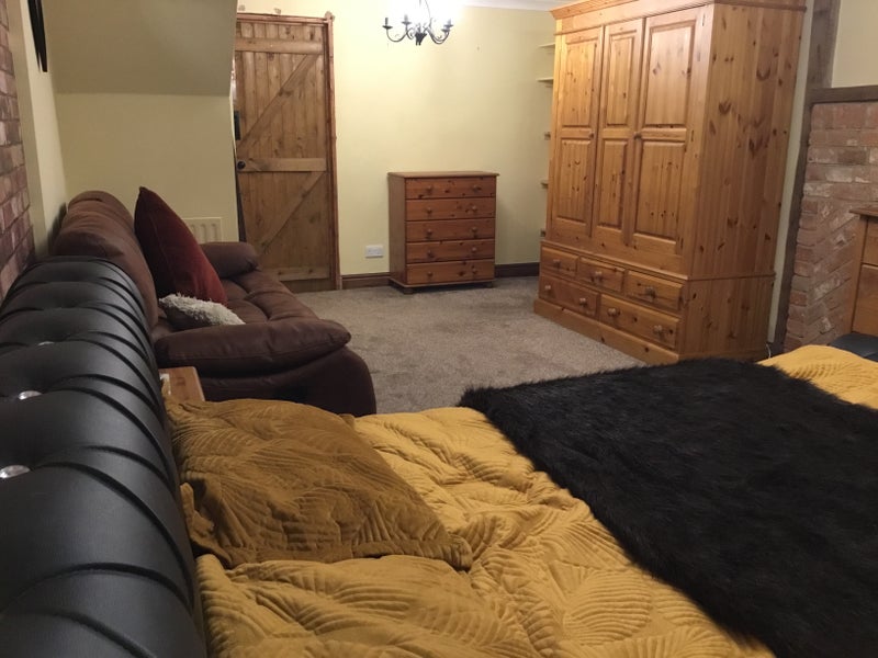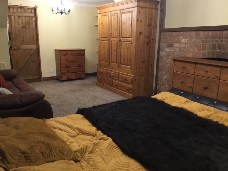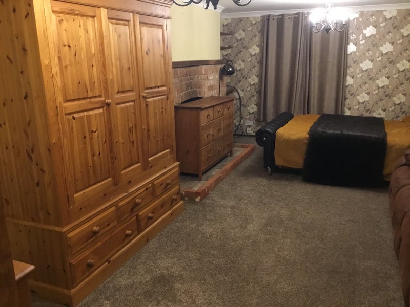 This gorgeous room is Large enough for a seating area as well lots of storage including a triple solid wood wardrobes and multiple sets of solid wood draws . Lots of shelving for storage , maybe books or collectibles as well two bedside tables and a large comfortable king size bed . ( this room is not your normal room found on here 10ft x 12ft with a small bed and a bedside table and small set of draws ) it’s a completely different deal very spacious and more then amply furnished.)