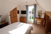The room has a double bed, a comfortable armchair, 32" wall-mounted TV with AppleTV, dressing table and chair, mirrors, two chests of drawers, clothes rail, and electric blanket. The room also has a dehumidifier for drying clothes quickly.