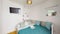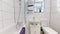 The modern bathroom has ample storage and a shower over bath.